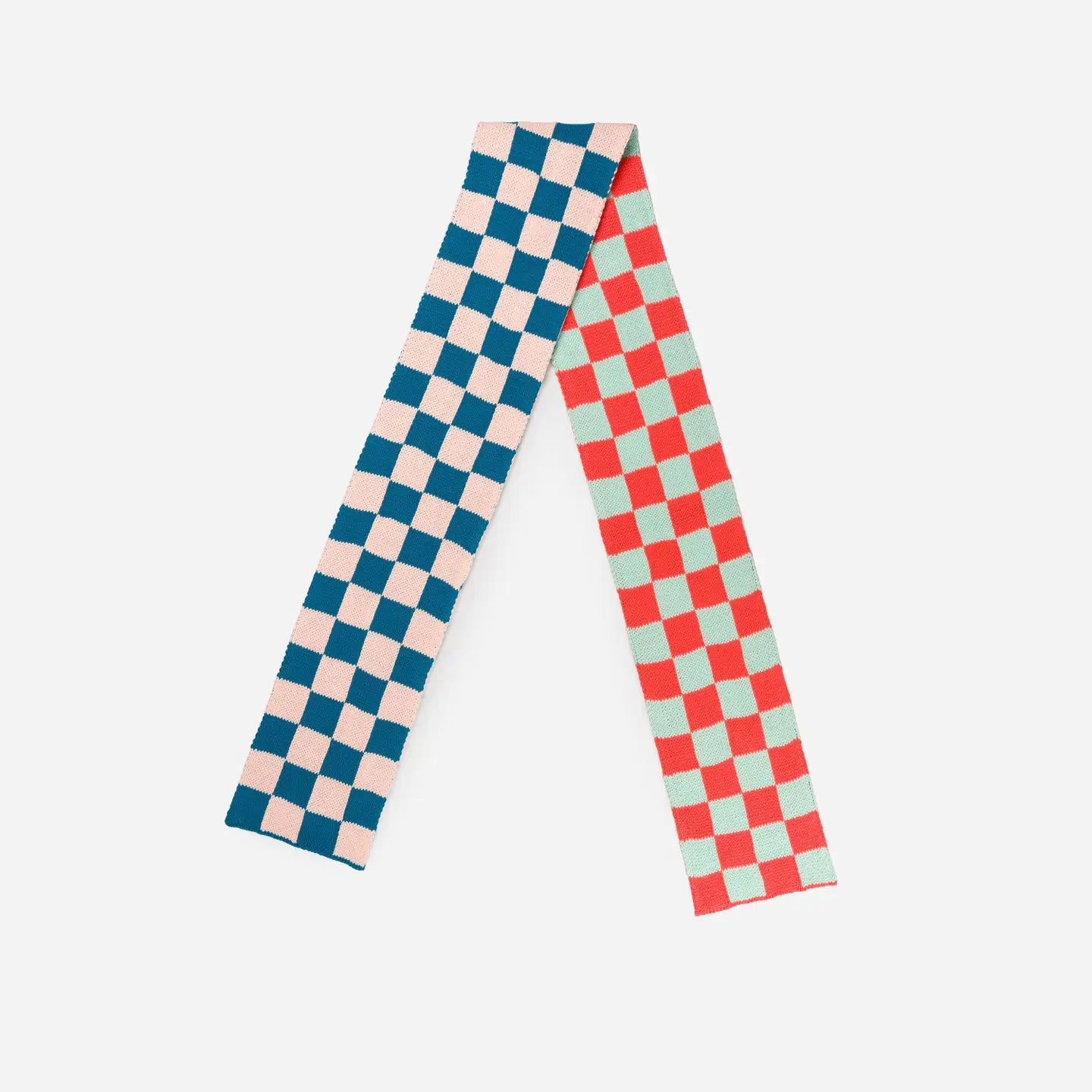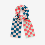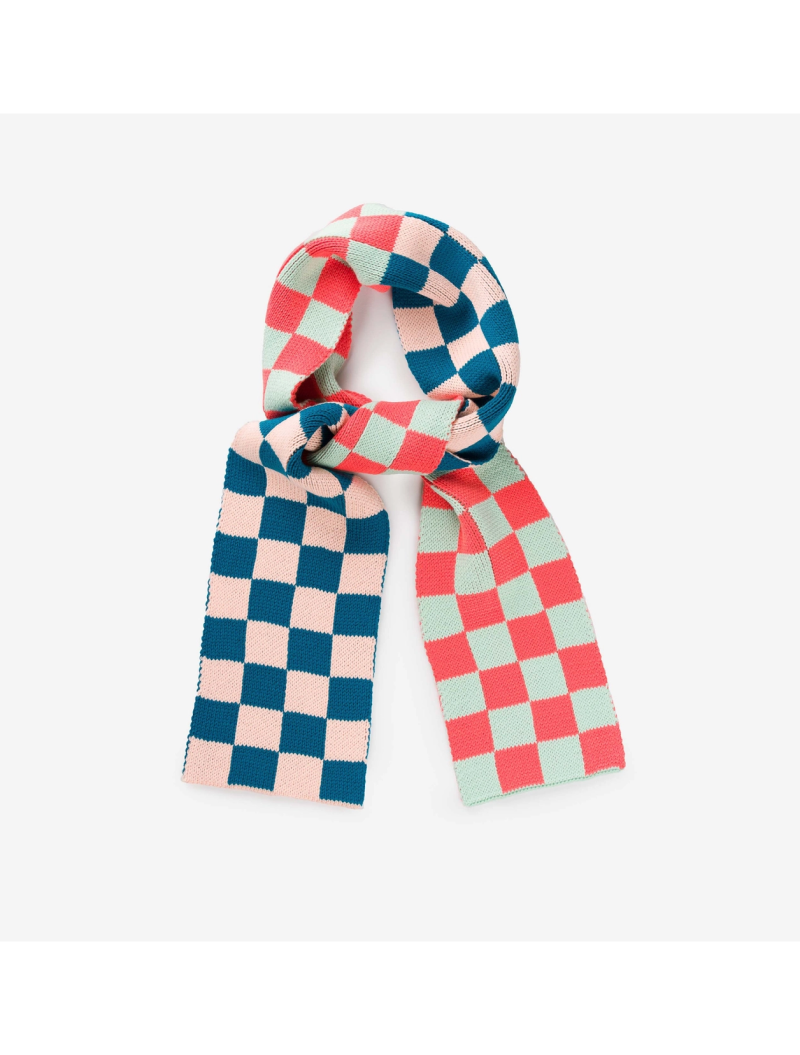 Pequeña y desenfadada bufanda de punto jacquard con patrón damero en colores vibrantes. Se puede llevar suelta o anudada para mayor calidez. Hecha con hilo hipoalergénico. Reversible.