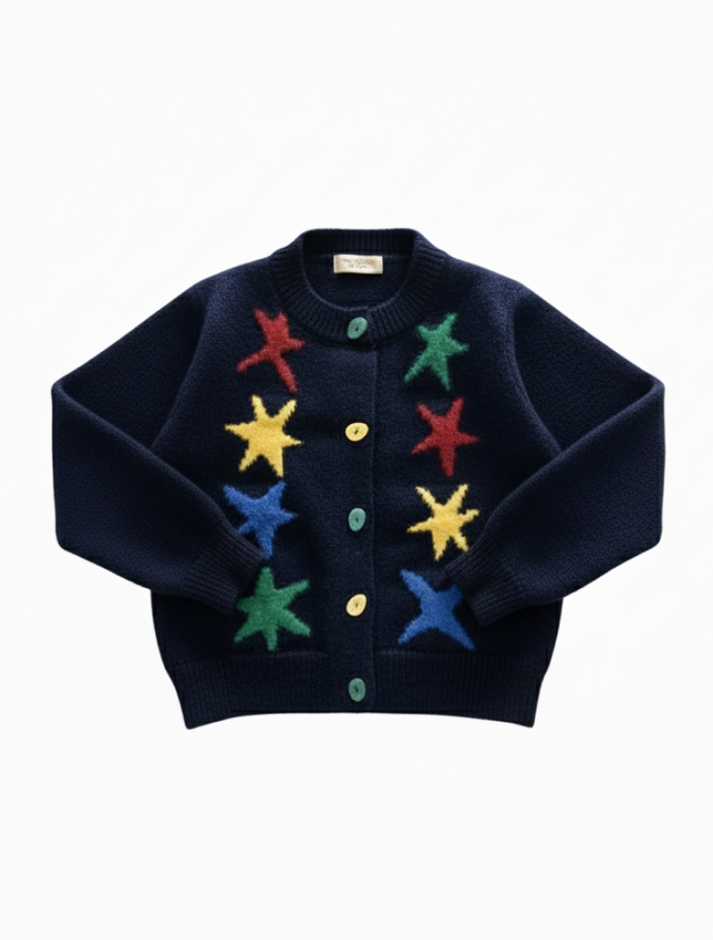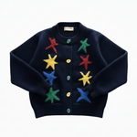 Navy blue button-down jacket with embroidered stars in four colors. Stretch knit for added comfort. Round neck and regular fit. Oval buttons in three colors that match the stars.