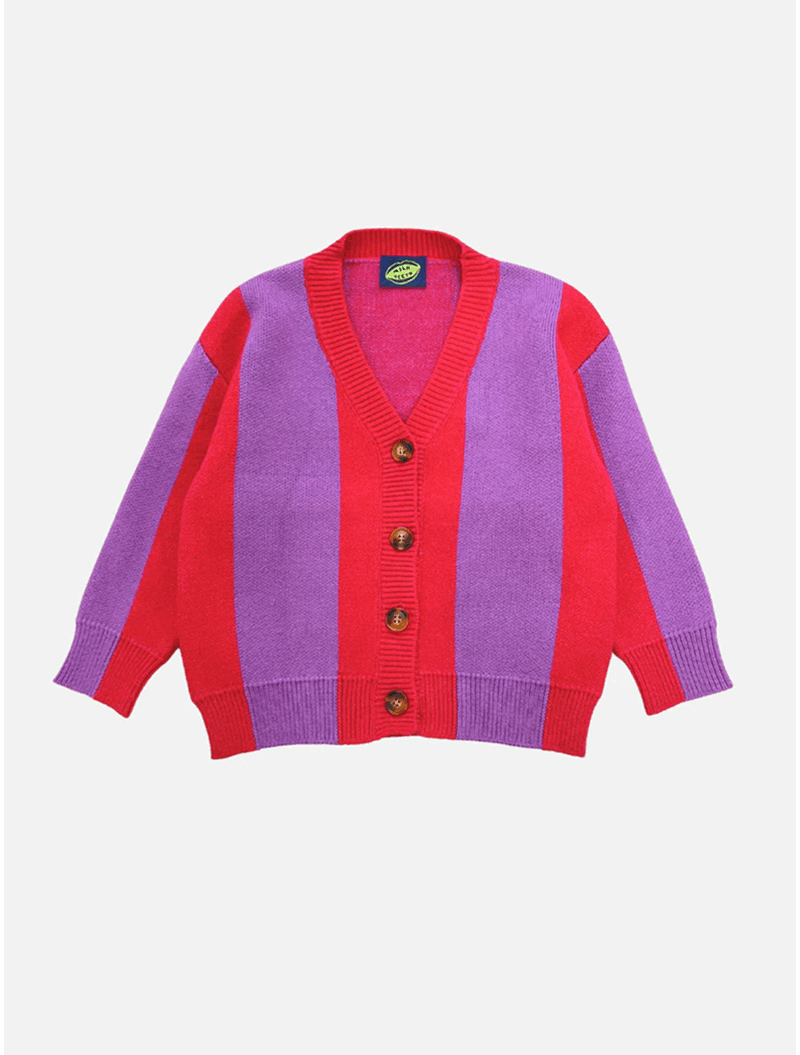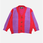 Unisex cardigan in super soft and stretchy intarsia fabric. This V-neck cardigan features front buttons and ribbed cuffs, hem, and collar. It has wide, two-tone vertical stripes in bold colors. A fun, oversized style, available in two colors.