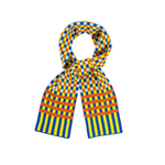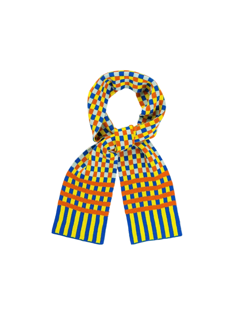 Pequeña y desenfadada bufanda de punto jacquard con patrón de rayas de microcuadros en colores vibrantes. Se puede llevar suelta o anudada para mayor calidez. Hecha con hilo hipoalergénico. Reversible.