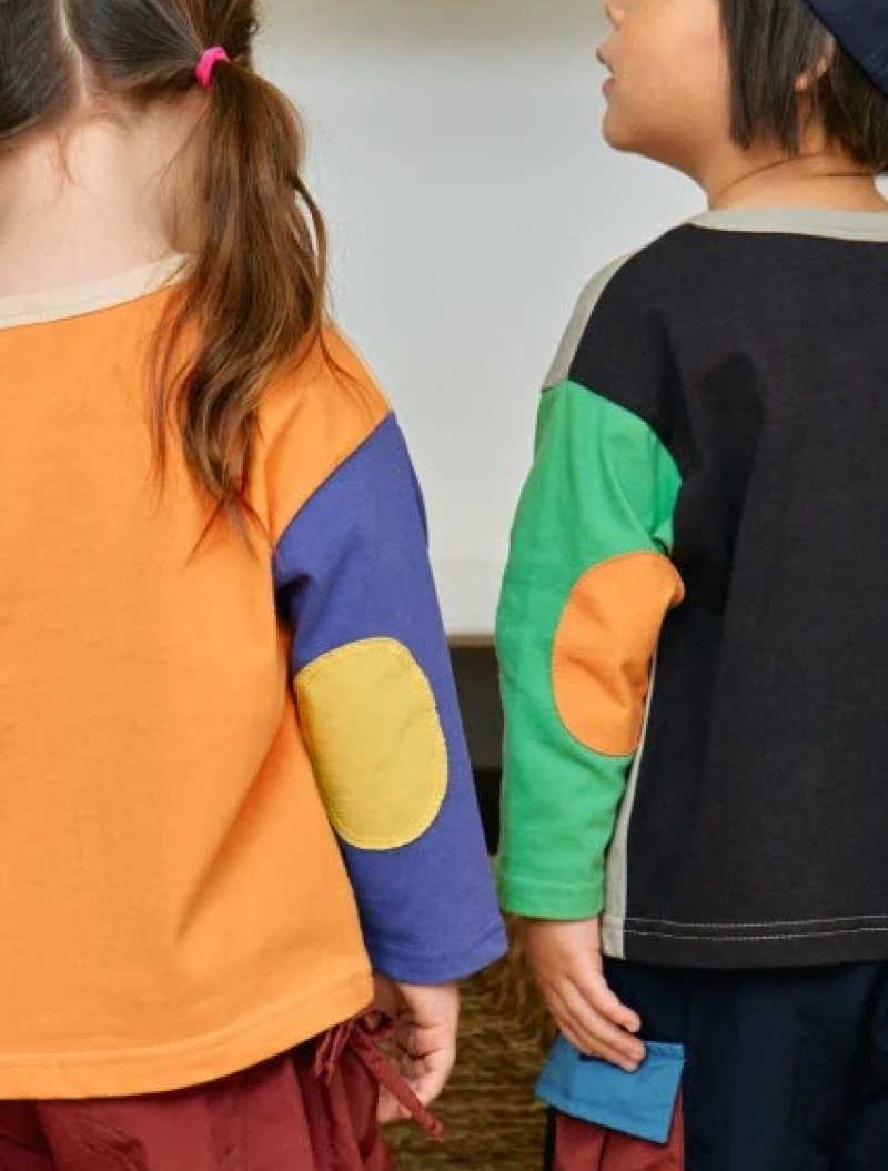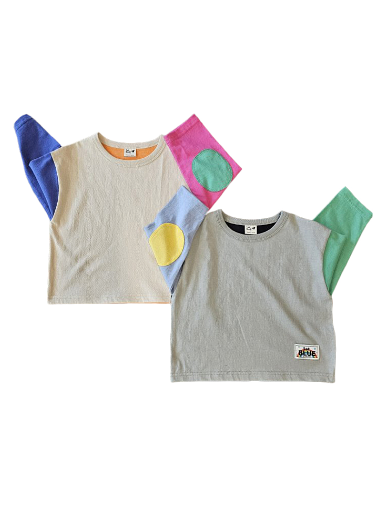 Camiseta unisex 100% algodón de manga larga en colores lisos y cuello redondo. Mangas en contraste de colores vivos y parches en los codos. Disponible en dos colores.