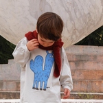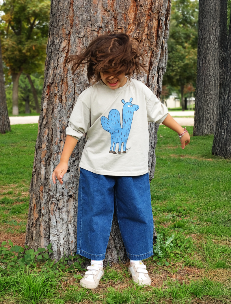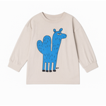 Camiseta de manga larga en color marfil y con ilustración de un camello azul. Corte ancho, puño marcado y cuello redondo.