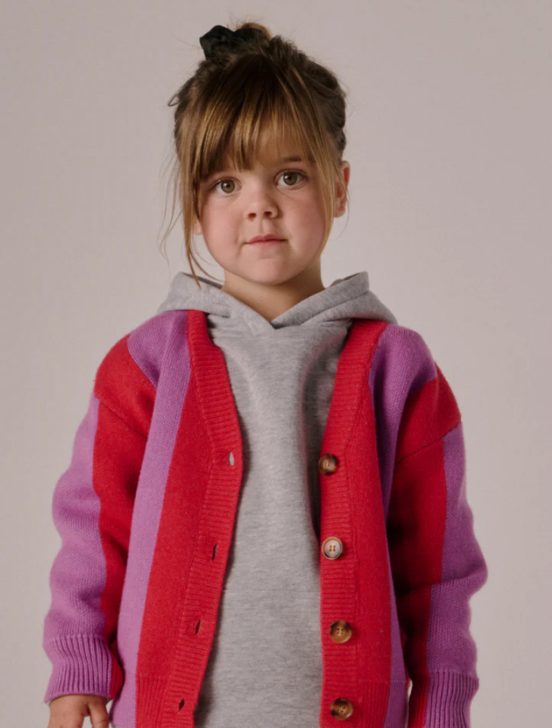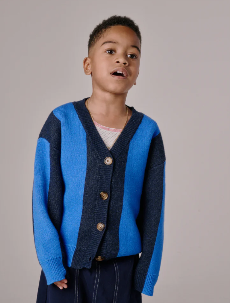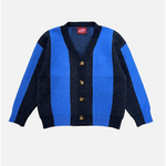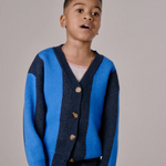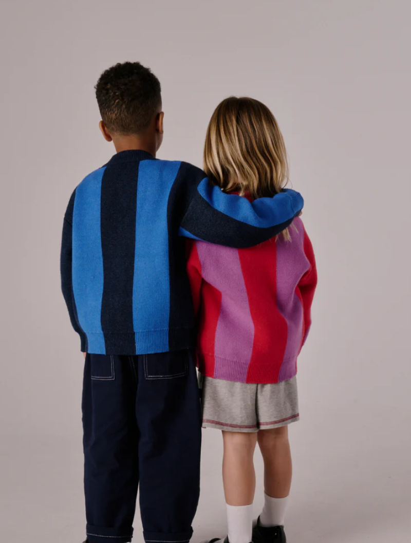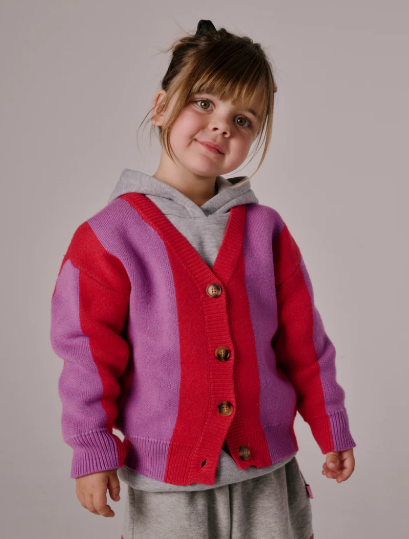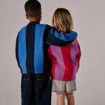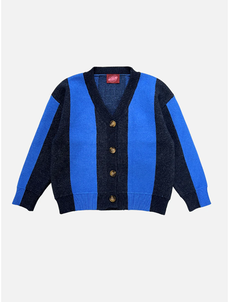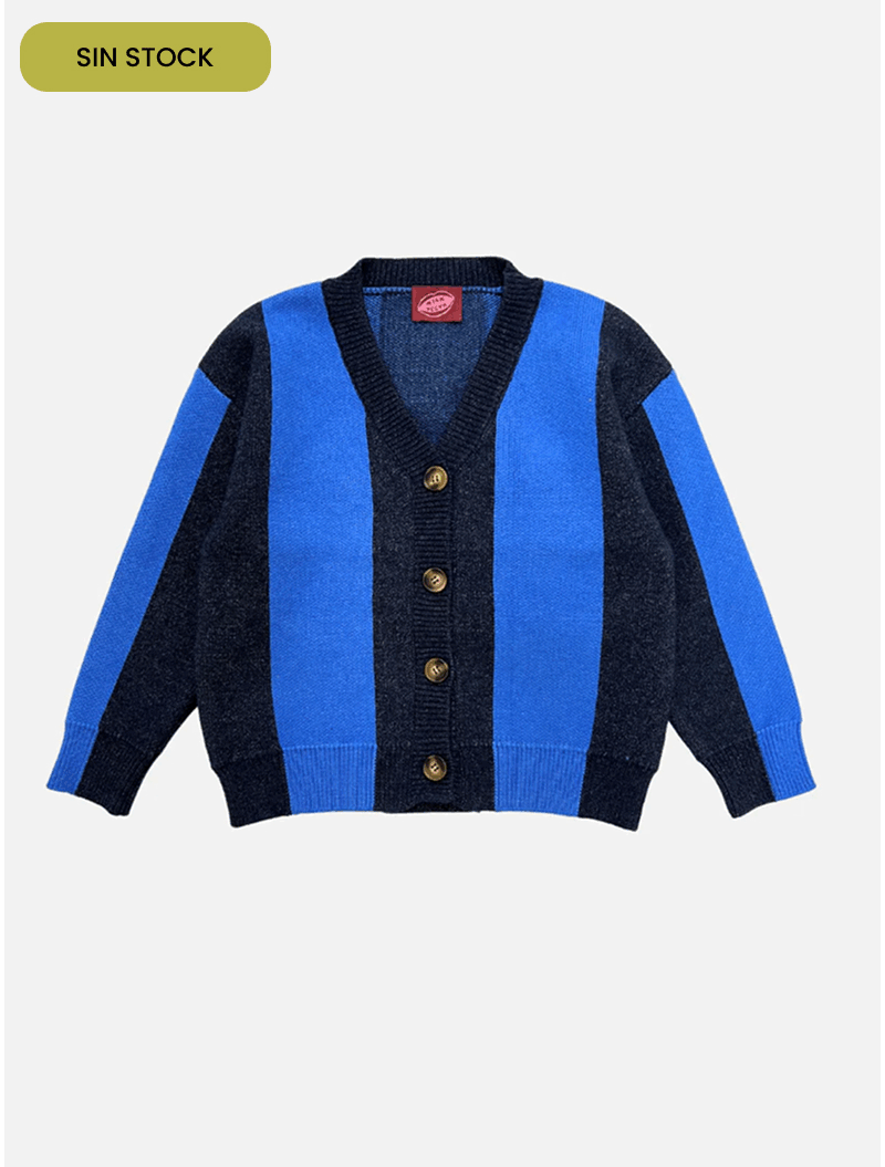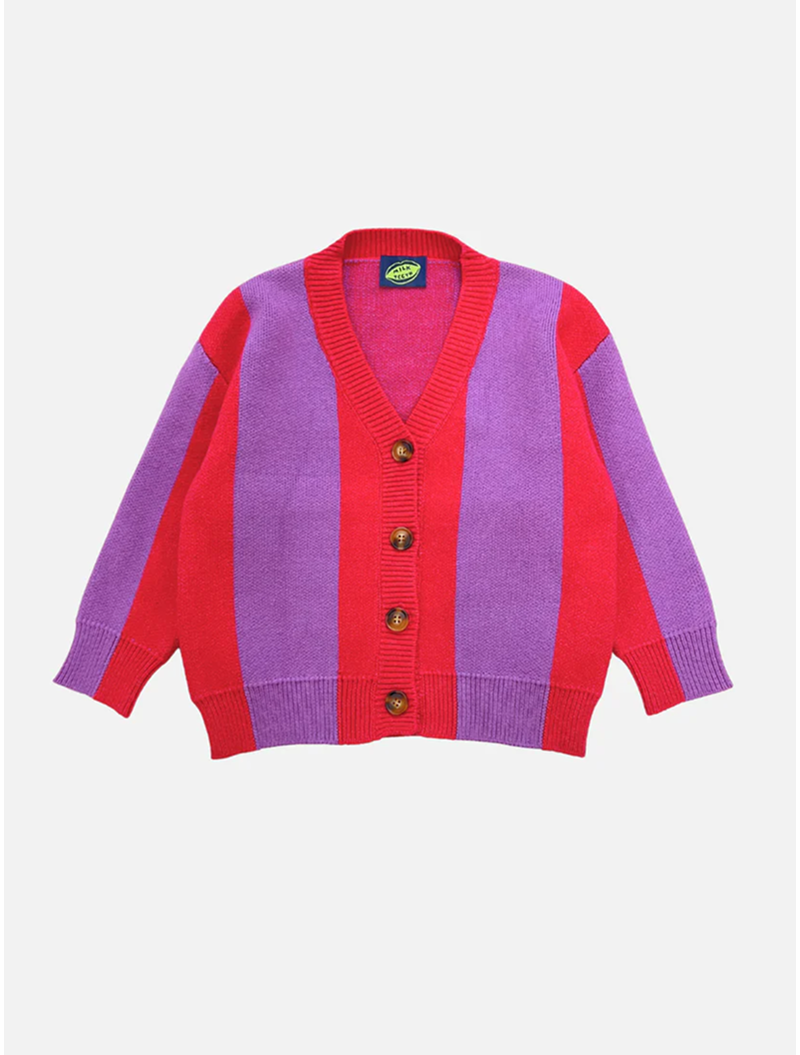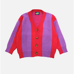 Chaqueta unisex en tejido intarsia súper suave y elástica. Este cárdigan de cuello en V cuenta con botones frontales y acabados de canalé en puños, cintura y cuello. Presenta rayas verticales anchas bicolor en colores intensos. Estilo oversize y divertido, disponible en dos colores.