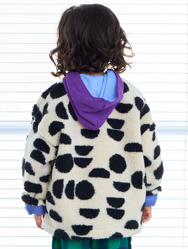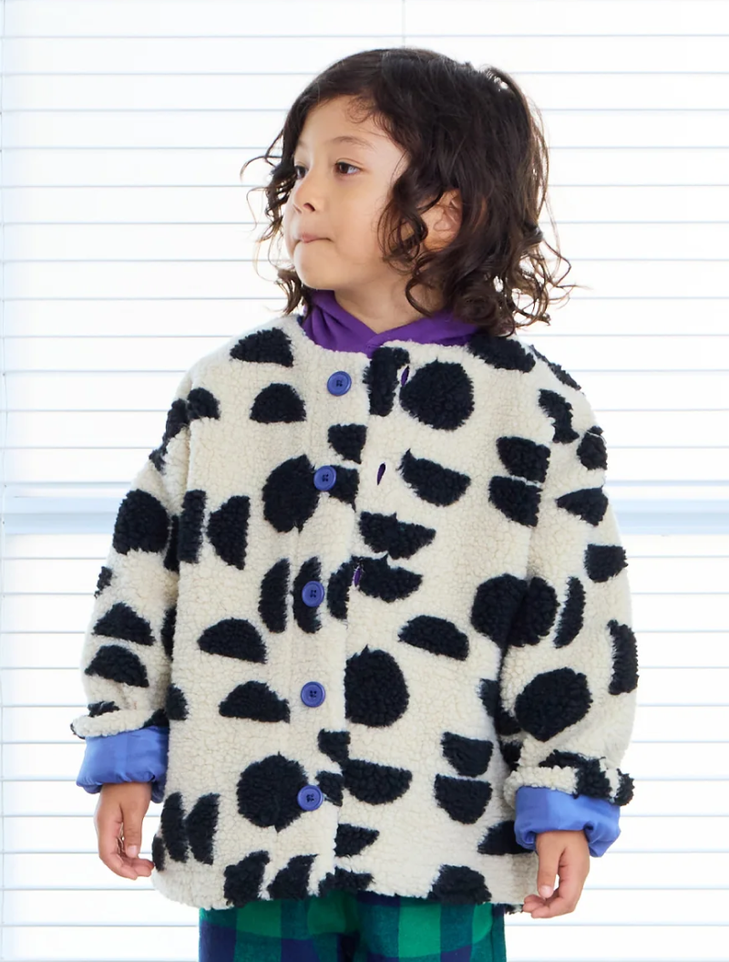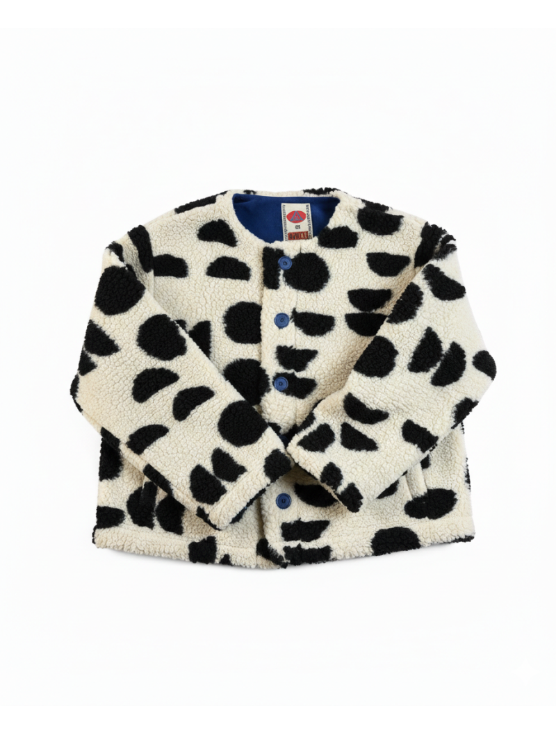 Chaqueta sherpa de entretiempo con estampado geométrico negro sobre blanco roto. Diseño japonés de corte oversize y hombros caídos que la hacen muy estilosa. Esta chaqueta unisex es ideal para como abrigo de primavera, con cuello redondo y cierre con botones en contraste azul, a juego con el forro interior, también lleva bolsillos laterales.
