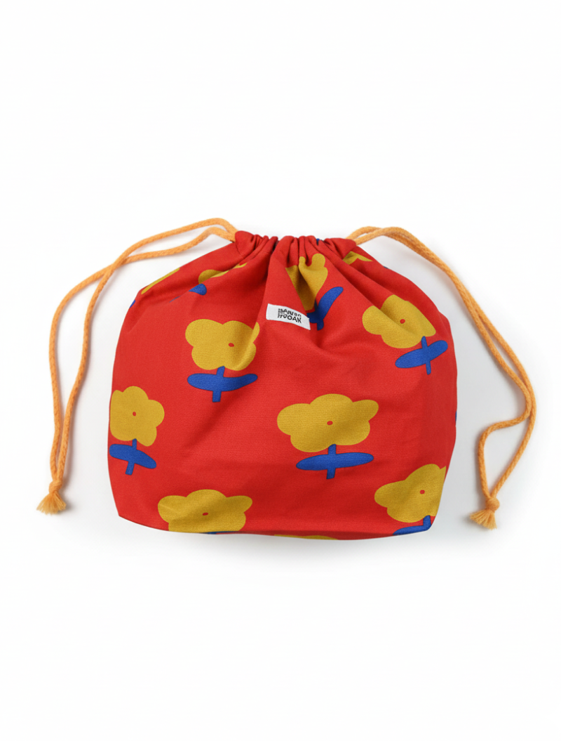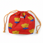 Bolsa de tela tipo saco con cuerda en contraste para ajustar. Hecha en algodón 100% con estampado impreso de flores sobre canvas rojo. Tiene un tamaño super práctico, se puede usar para llevar la merienda o como organizador de bolsos y maletas.
