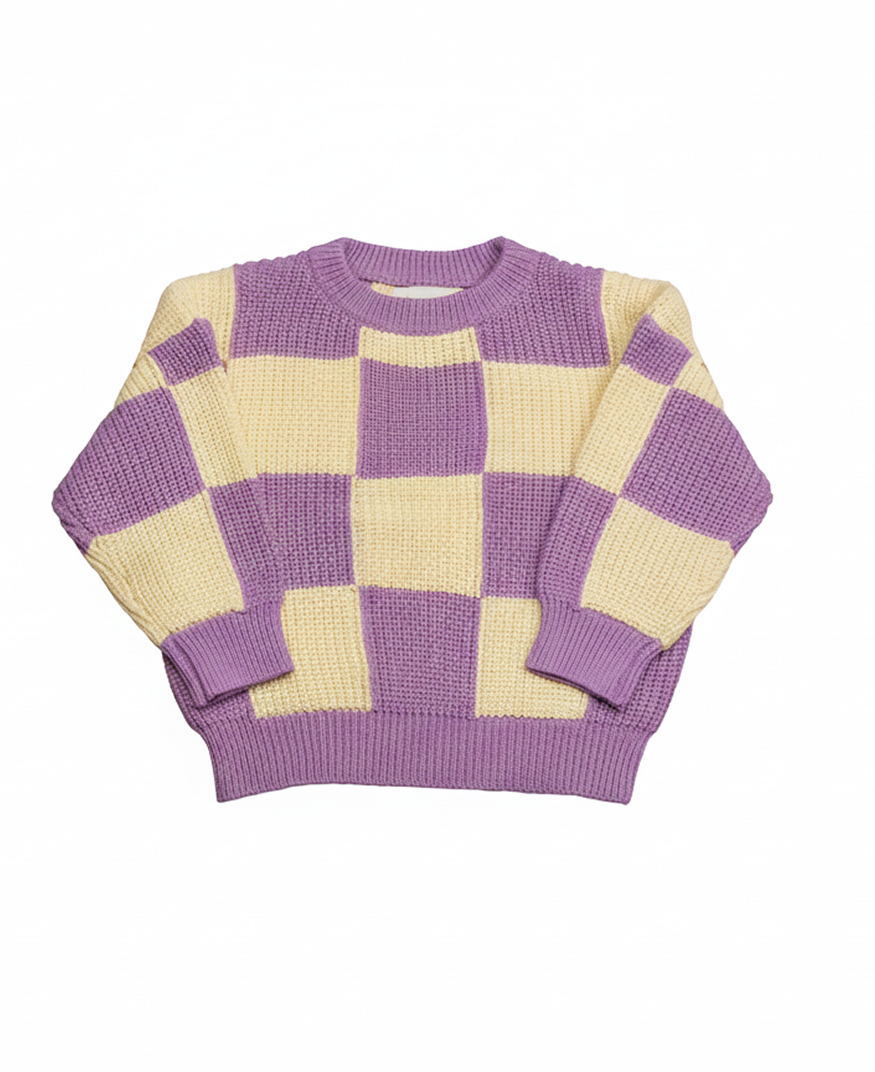 Jersey unisex de cuadros grandes bicolor, disponible en mostaza y beige o morado y beige. Cómodo, relajado y hecho en punto de algodón 100%. Disponible en dos colores.