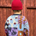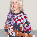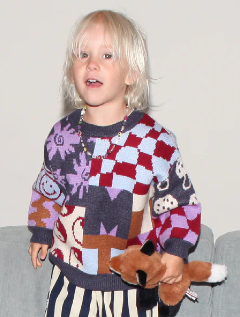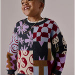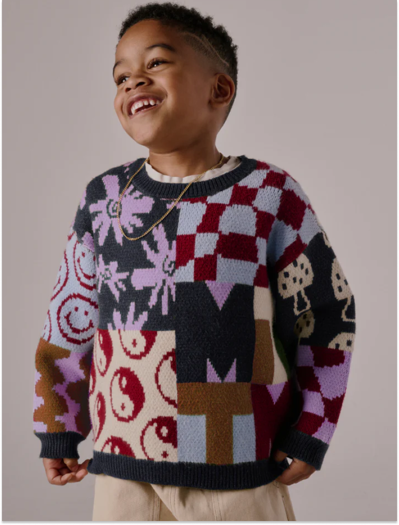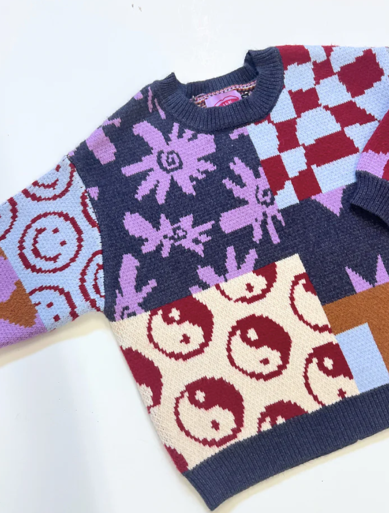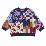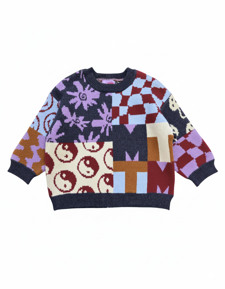 Suéter de cuello redondo y corte cuadrado con hombros caídos, acabados de canalé y un ajuste ligeramente oversize. Estampado multicolor en patchwork de caritas sonrientes, setas, flores, fresas y símbolos yin-yang, todo en punto elástico y suave que no pica.