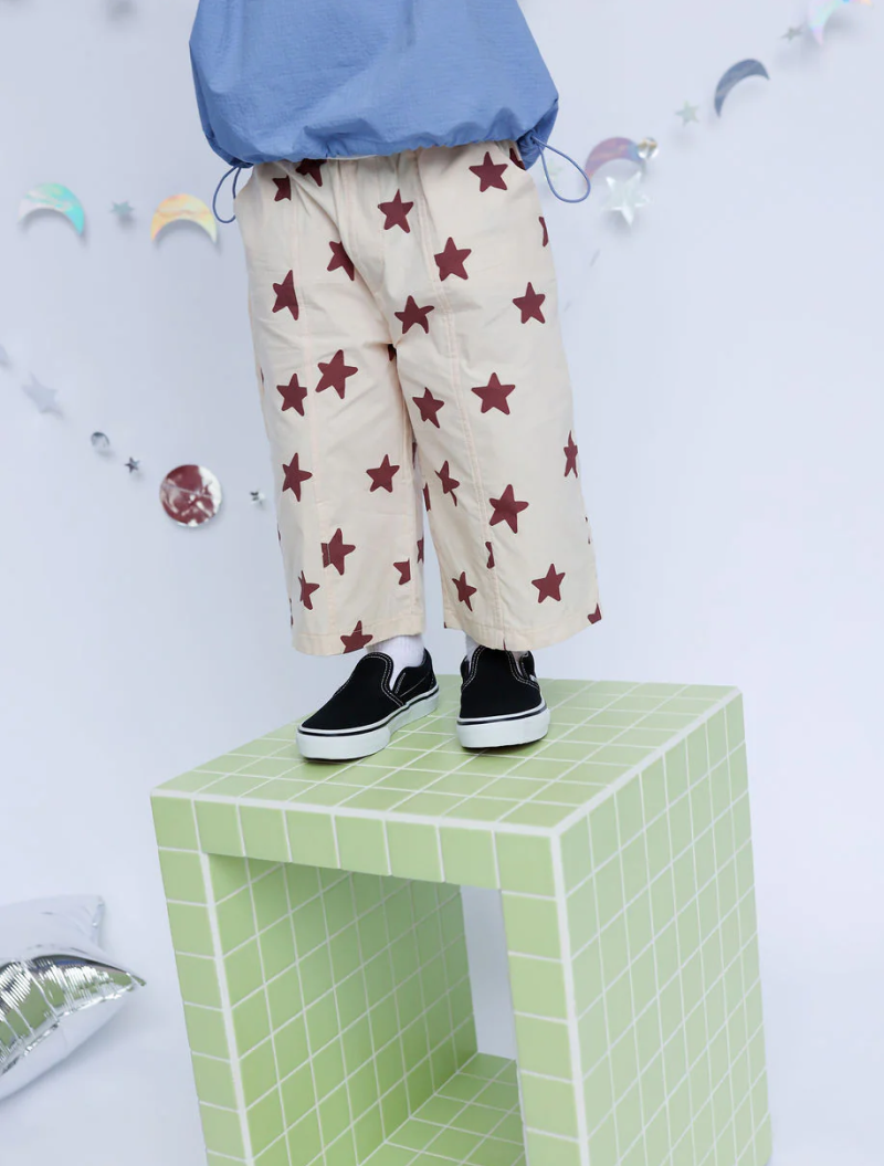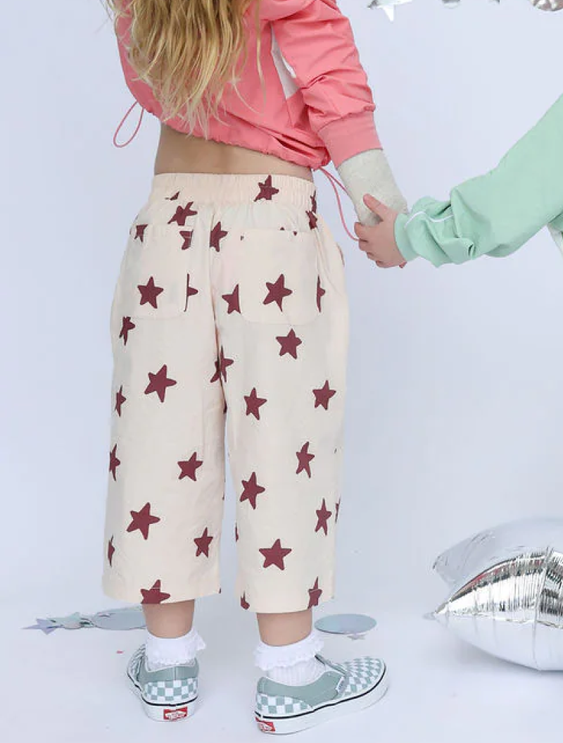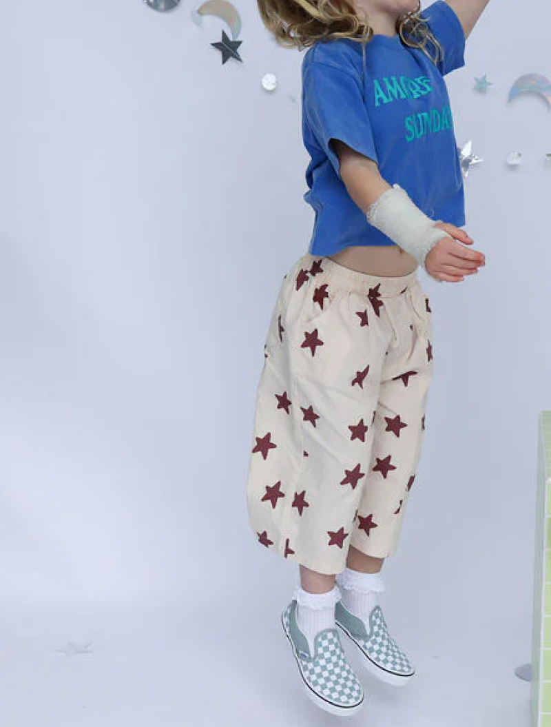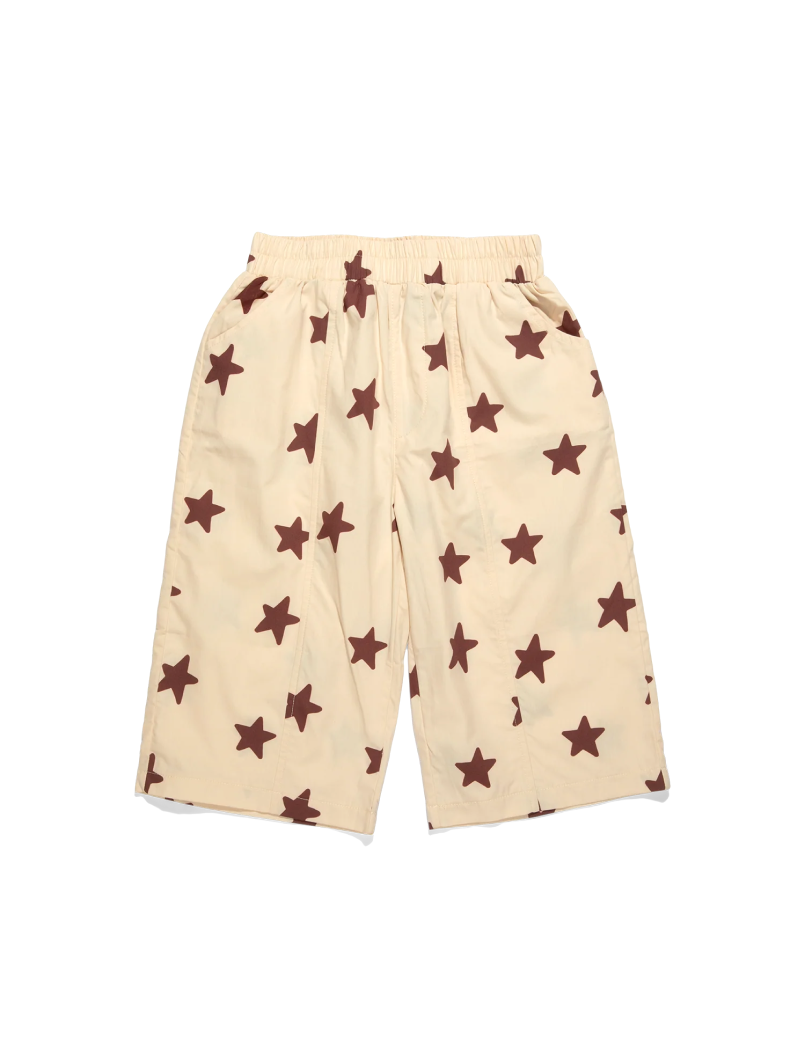 Pantalón unisex de algodón 100% con estampado de estrellas color marrón. Tela ligera, corte recto y cintura elástica. Bolsillos delanteros y traseros, y costura en medio. Se pueden llevar largos hasta el tobillo y crecen con el peque, con un corte pesquero.