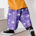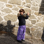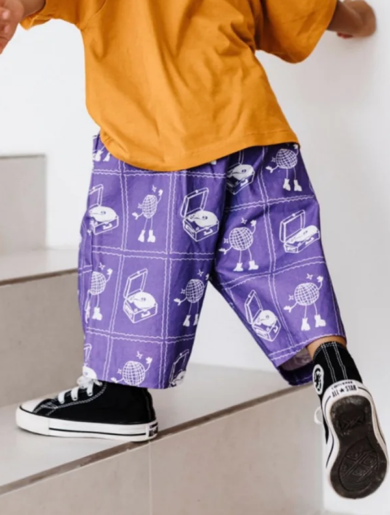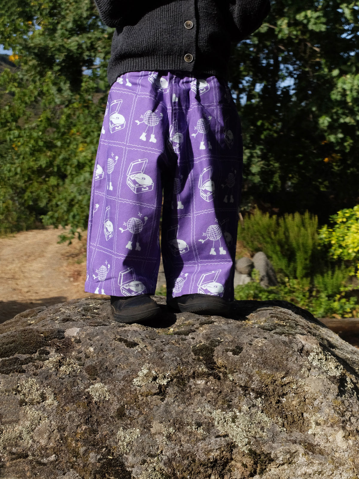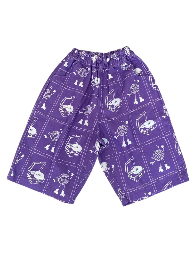 Pantalón unisex de lona con estampado en blanco sobre morado temática disco. Corte recto y suelto, largo hasta la pantorrilla. Con cintura elástica y bolsillos delanteros y traseros.