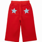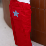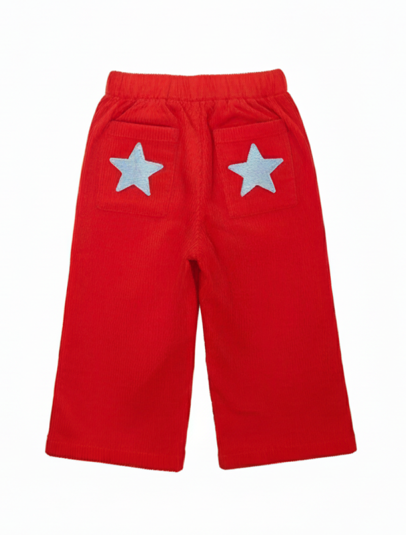 Hechos de una tela de pana ligera y de alta calidad en color rojo vibrante. Tienen un corte de pierna ancha con cintura elástica y bolsillos de parche en la parte trasera. Bordado distintivo de estrella azul metalizado en ambos bolsillos.