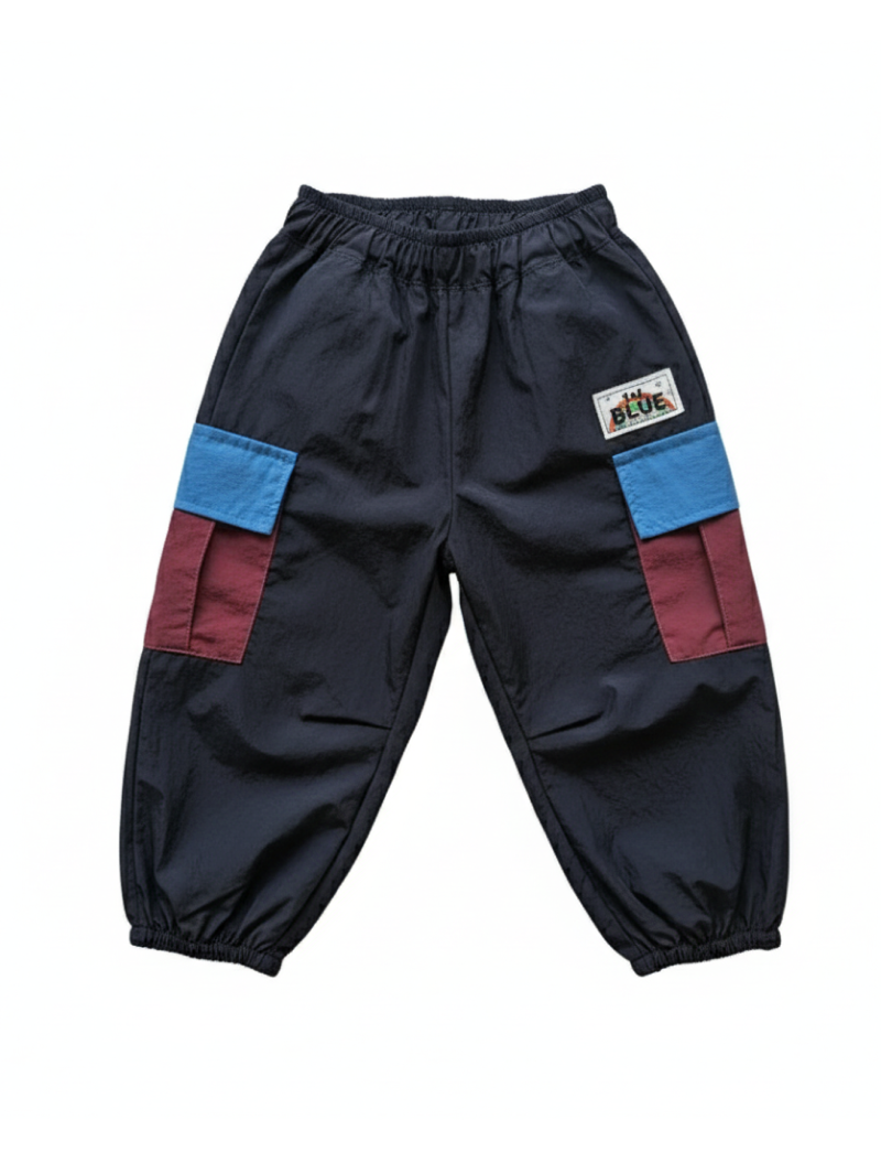 Pantalón cargo azul oscuro con bolsillos laterales bicolor. Tela fina de y goma en cintura y tobillos. Corte ancho y super estiloso, perfectos para hacer deporte o ir al parque.