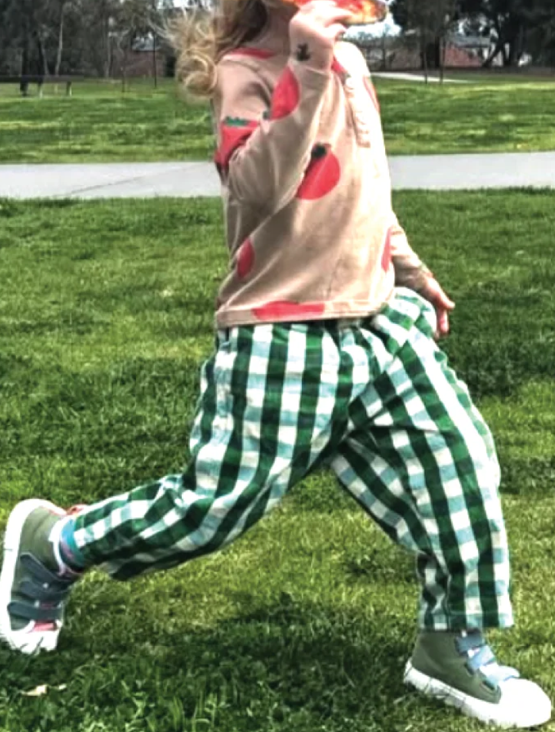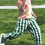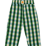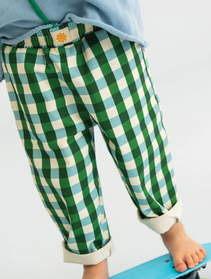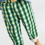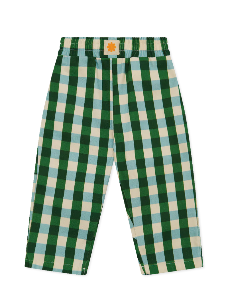 Pantalón unisex de sarga, 100% algodón. Estampado de cuadro vichy en tonos verdes y crema, tintado naturalmente. Corte holgado y goma en la cintura.