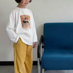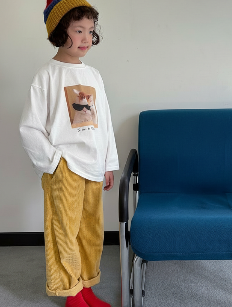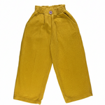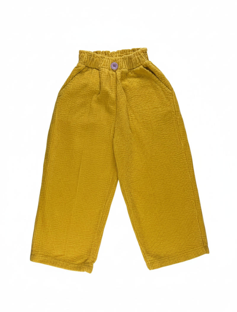 Pantalón de pana unisex color amarillo con botón detalle frontal de color lila. Pantalón ancho y super elástico, para ir cómodo y abrigado. Lleva bolsillos laterales y cintura elástica.