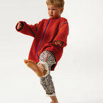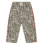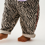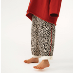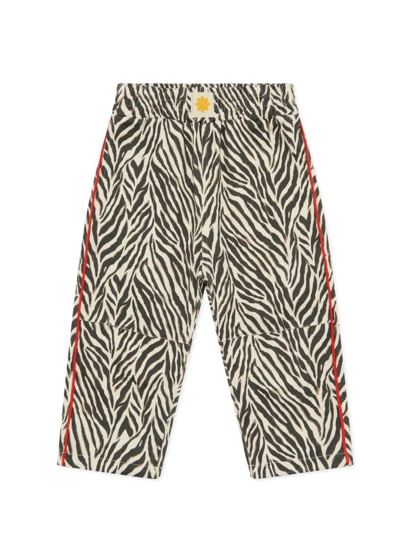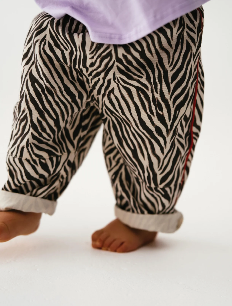 Pantalón unisex confeccionado en twill 100% de algodón, suave y resistente, pensado para acompañar el movimiento diario con total comodidad. Presenta un estampado de cebra y un ribete rojo en contraste. Cuenta con cintura elástica para un ajuste cómodo y bolsillos laterales funcionales. Su corte es fiel a la talla, con un fit relajado (slouchy).