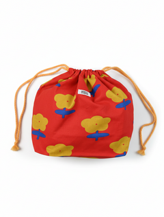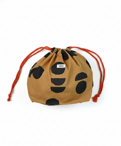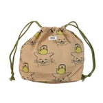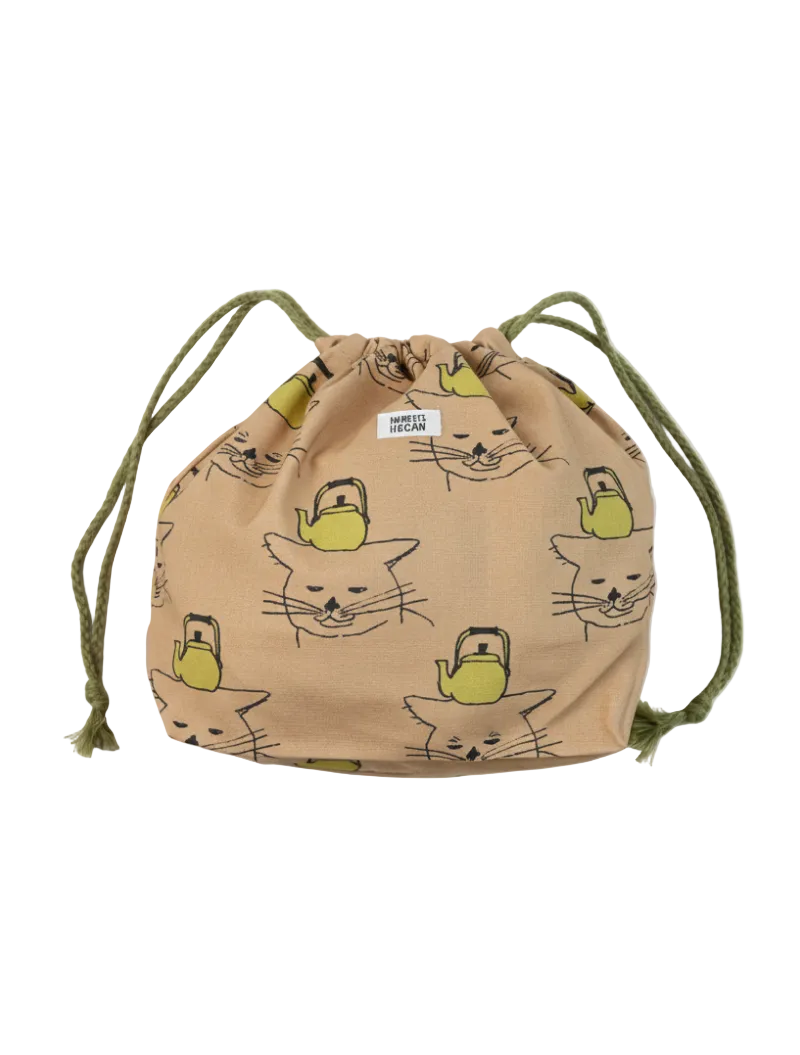 Bolsa de tela tipo saco con cuerda en contraste para ajustar. Hecha en algodón 100% con estampado impreso de gatos con tetera sobre canvas beige. Tiene un tamaño super práctico, se puede usar para llevar la merienda o como organizador de bolsos y maletas.