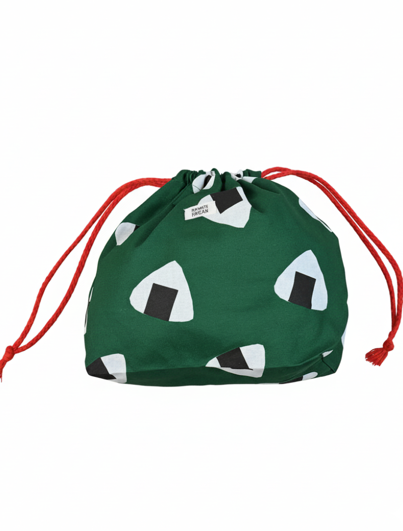 Bolsa de tela tipo saco con cuerda en contraste para ajustar. Hecha en algodón 100% con estampado impreso de gatos con onigiri sobre canvas verde. Tiene un tamaño super práctico, se puede usar para llevar la merienda o como organizador de bolsos y maletas.